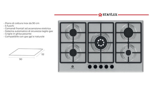 Staylux piano cottura 90 CM acciaio gas metano gpl inox 5 fuochi in ghisa